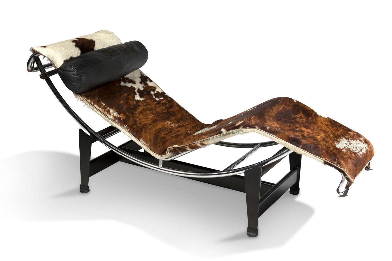 A “LC4” lounge chair, model designed in 1928, chromed tubular metal frame stretched with bungee cords, covered with foal skin, sliding on a black lacquered metal frame, rubber feet.