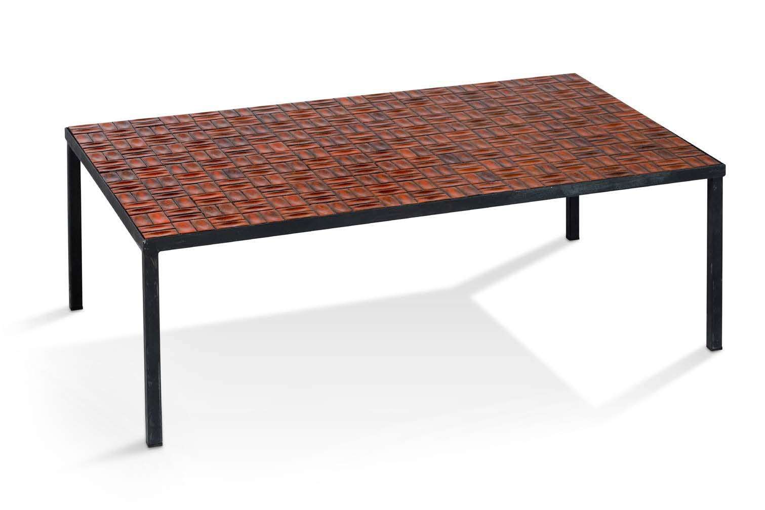 Structure en fer forgé, plateau rectangulaire recouvert de carreaux de céramique émaillée orange et brun.