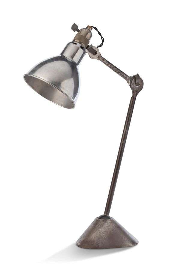A modernist desk lamp, c. 1930, nickeled metal arm, aluminum mobile deflector, nickeled cast iron base.