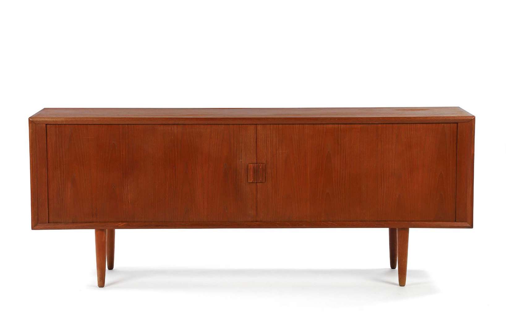 En teck et placage de teck, ouvrant par deux vantaux coulissants à lattes, découvrant un intérieur muni de deux étagères encadrant quatre tiroirs, piètement quadripode fuselé.