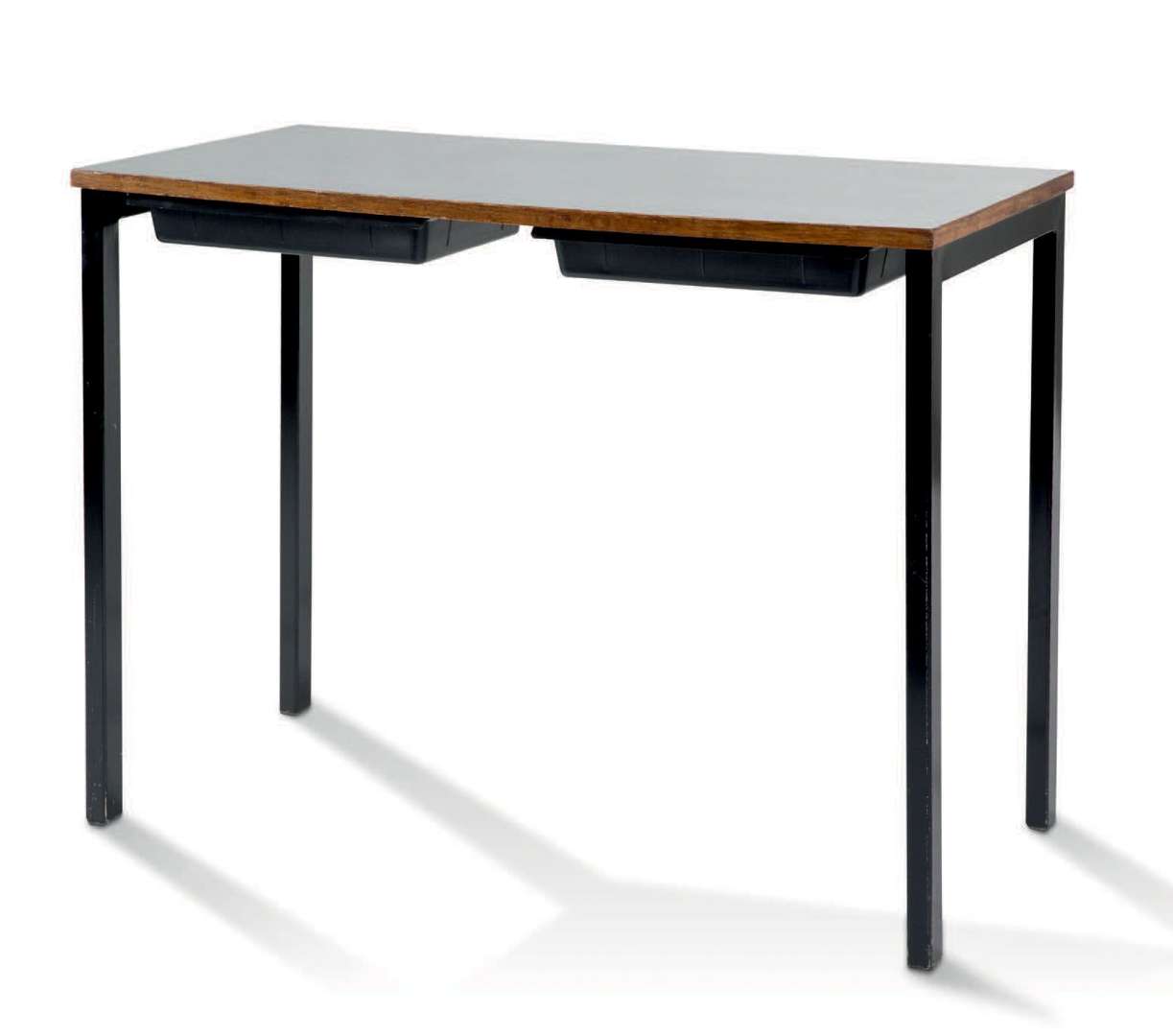 Plateau en bois stratifié gris, tiroirs en plastique thermoformé, reposant sur un piètement en métal laqué noir.