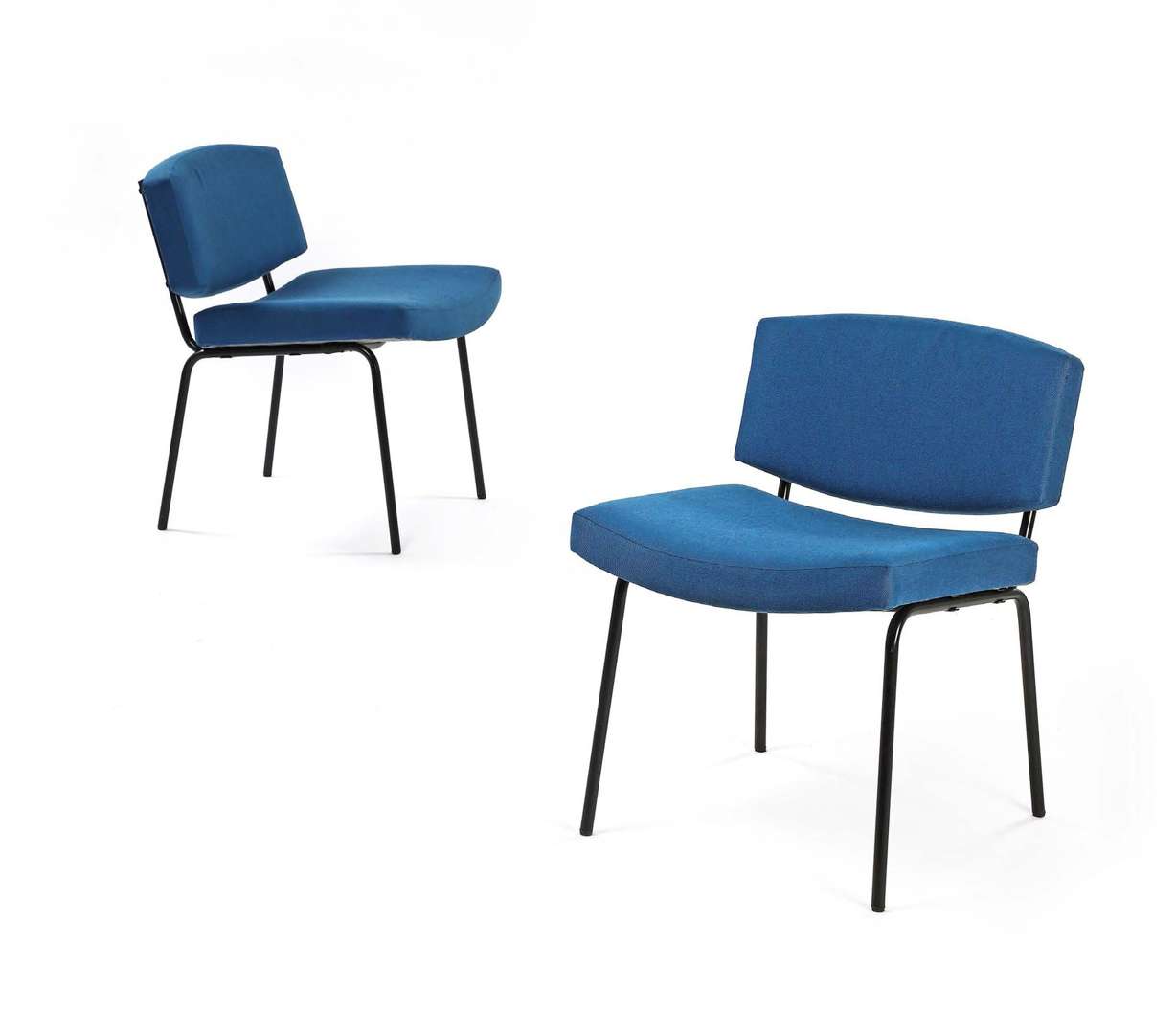 A pair of “Conseil” chairs, model designed in 1962, structure covered with foam, later blue cotton upholstery, black re-lacquered metal feet.