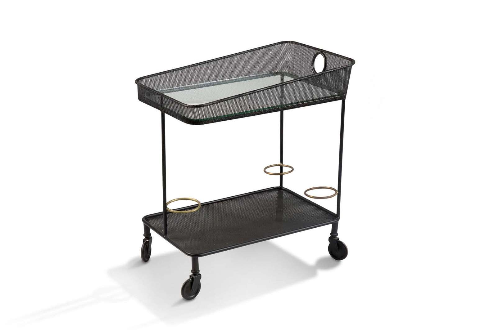 Structure en métal tubulaire laqué noir, plateau inférieur et bordure du plateau supérieur formant galerie en rigitulle noire, plateau supérieur en verre postérieur, trois porte-bouteilles à la partie inférieure formés d'anneaux de laiton, piètement reposant sur des roulettes.