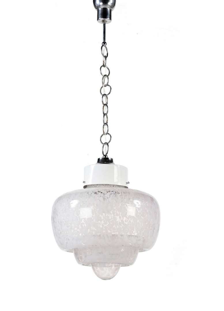 Structure en métal laqué blanc, retenant trois parties imbriquées en gradins en verre de Murano translucide à décor de coulures de verre blanc.