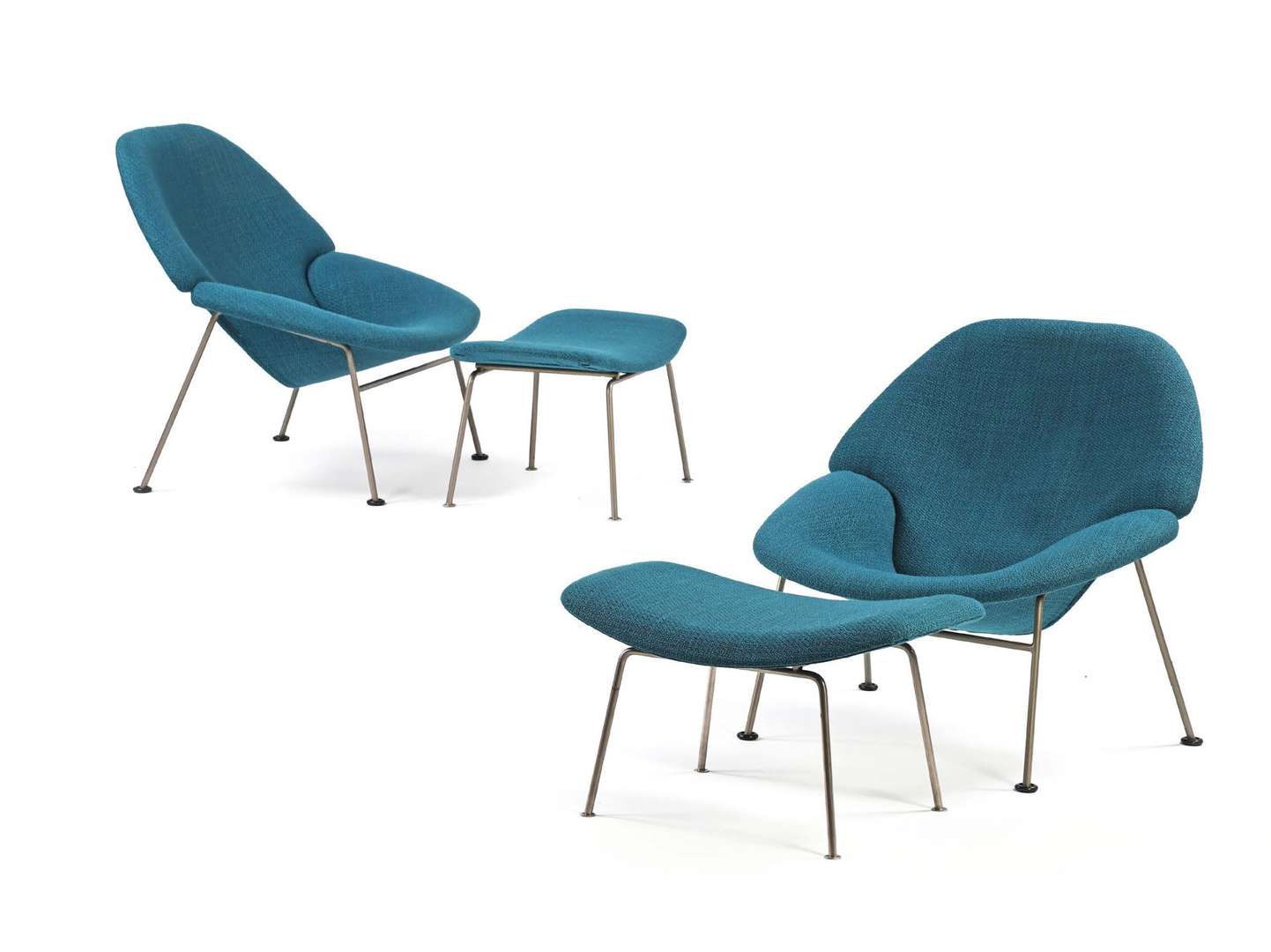 Paire de grands fauteuils corolles, modèle « 555 » créé circa 1965, et leurs ottomans