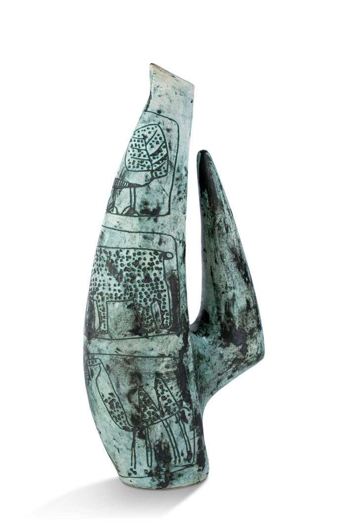A “Coq” pitcher, c. 1957, unique piece, enamelled earthenware, incised decoration.