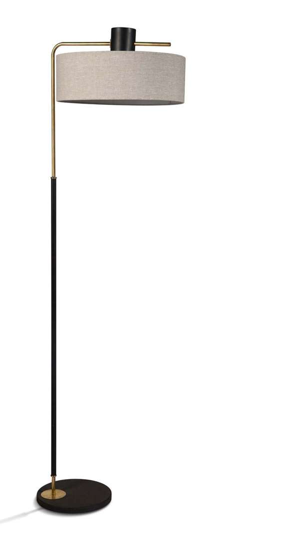 Fût tubulaire en métal laqué noir et laiton doré, base en fonte laquée noir, abat-jour postérieur en coton greige.
