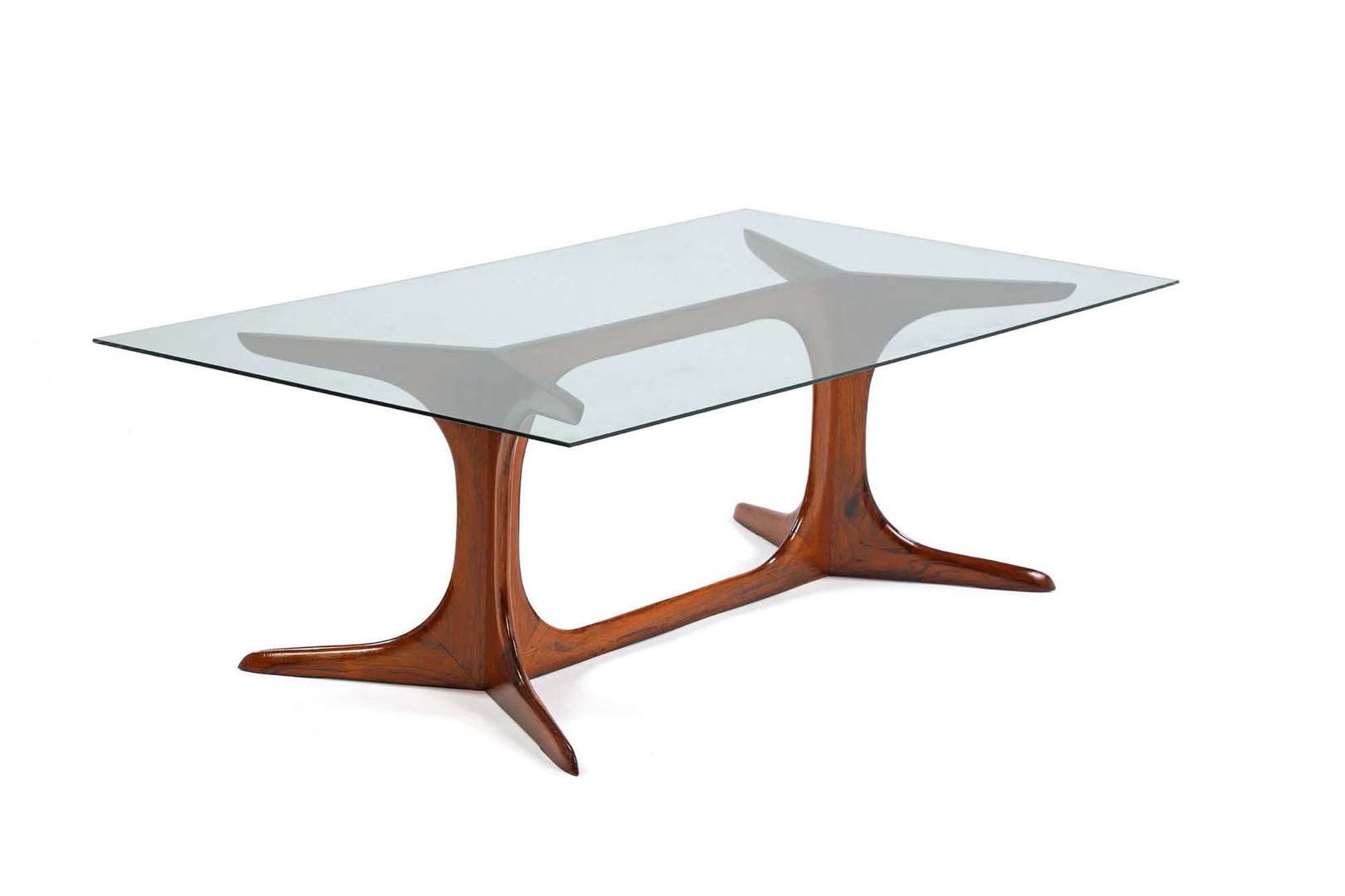 Piètement formant double arcature cruciforme en palissandre verni, plateau rectangulaire en verre.