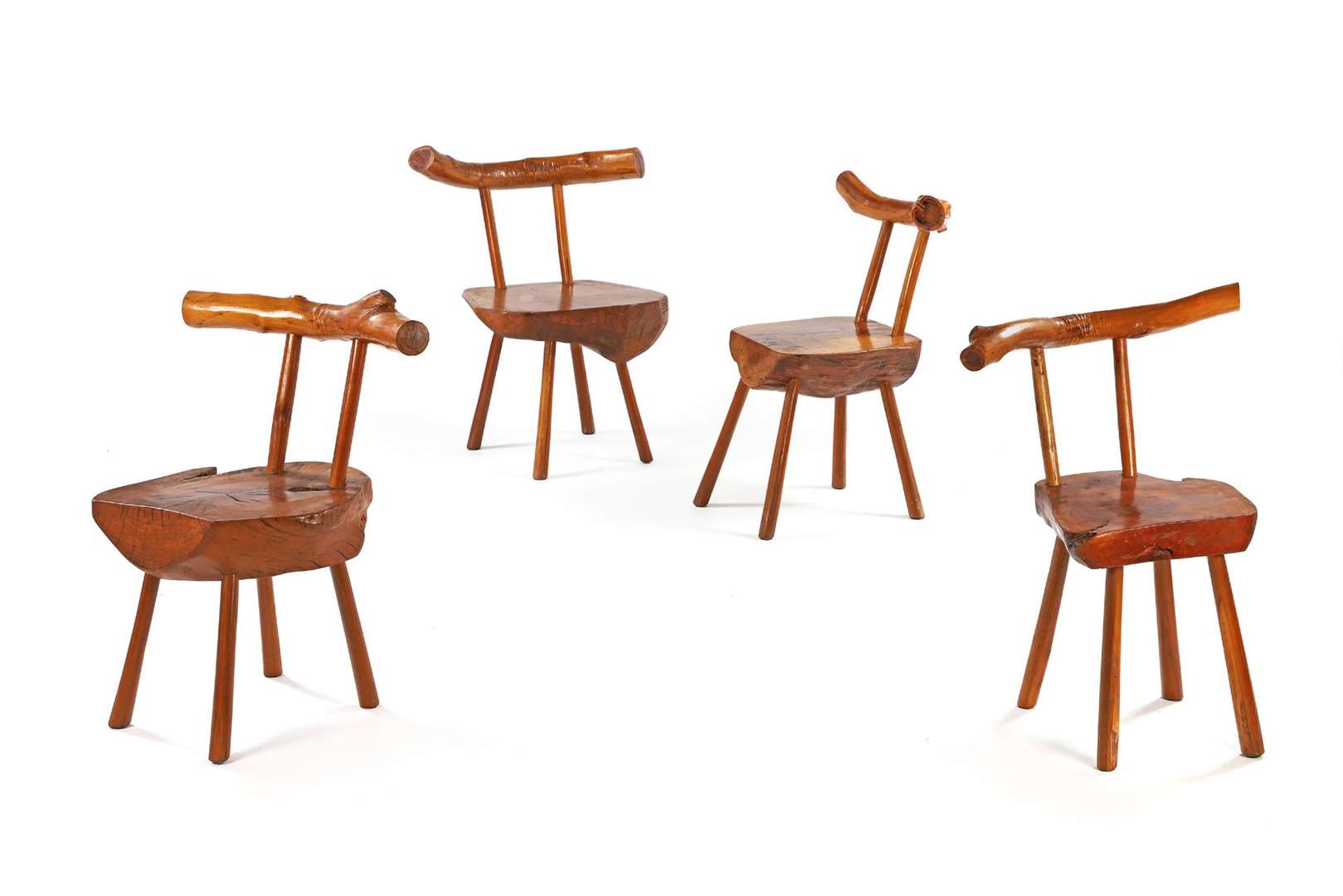 En bois résineux, le dossier formé de sections de branches, épaisse assise, piètement quadripode.