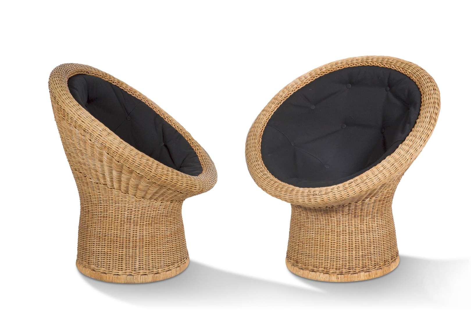 A pair of "E11" armchairs, designed c. 1967, woven wicker, later black cotton cushion.