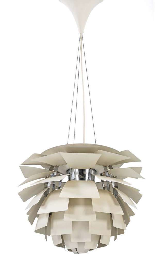 An “Artichoke” ceiling lamp, model designed in 1958, stainless steel structure and white lacquered steel slats.