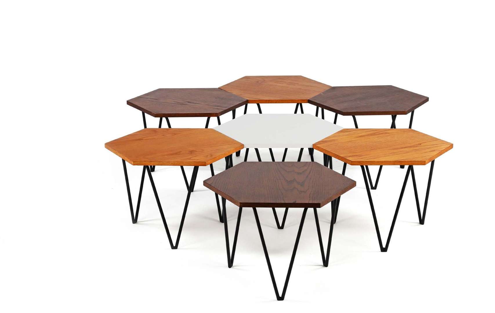 Plateau hexagonal, l'un en mélaminé blanc, trois en placage de frêne naturel, trois en placage de frêne teinté brun, piètement tubulaire en métal laqué noir.