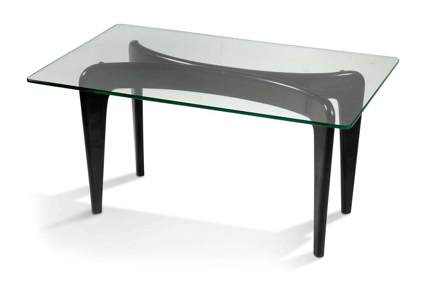 Table basse, piétement formant deux arcatures souples en noyer teinté noir, plateau rectangulaire à angles arrondis en verre fumé.