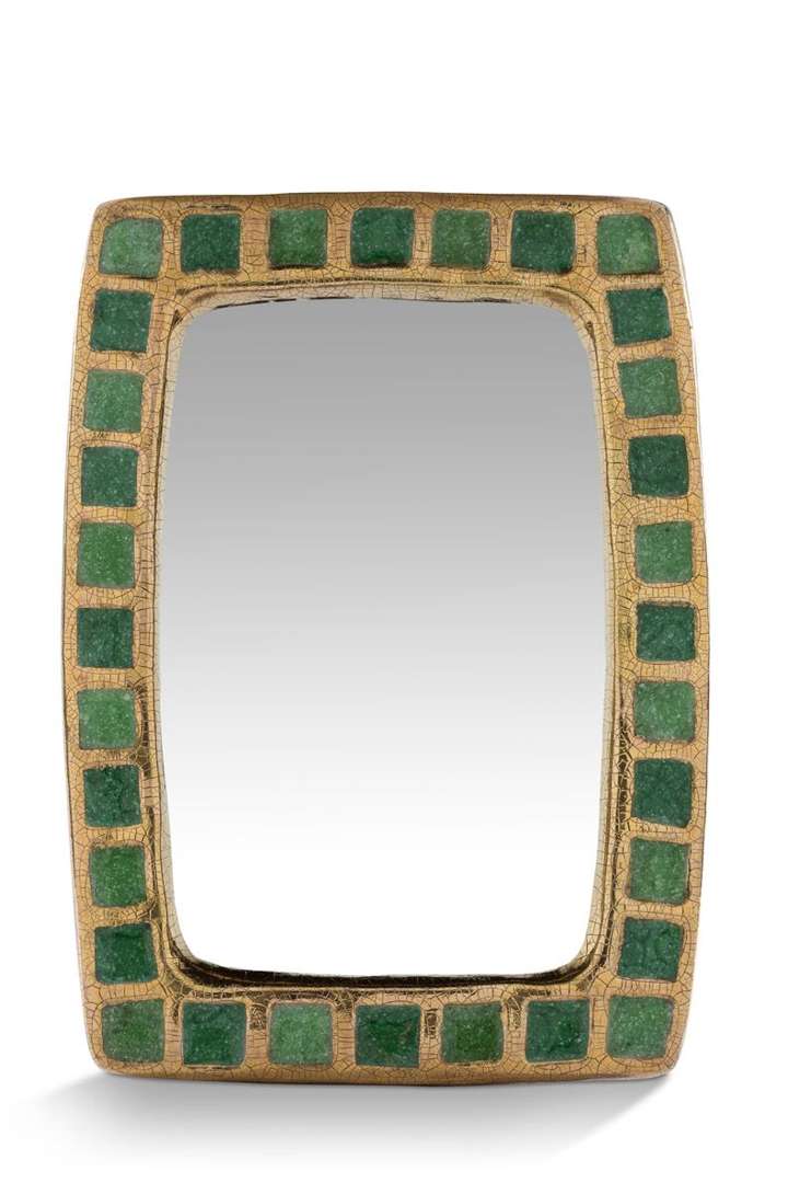 A “Pâte de verre long” mirror, model designed c. 1950-1955, ceramic frame, green glass tiles, gilt enamelled background.