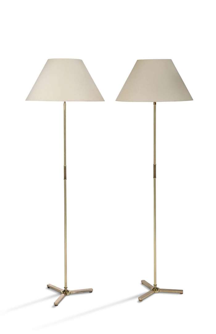 A pair of floor lamps, brass stem, white cotton lampshade.