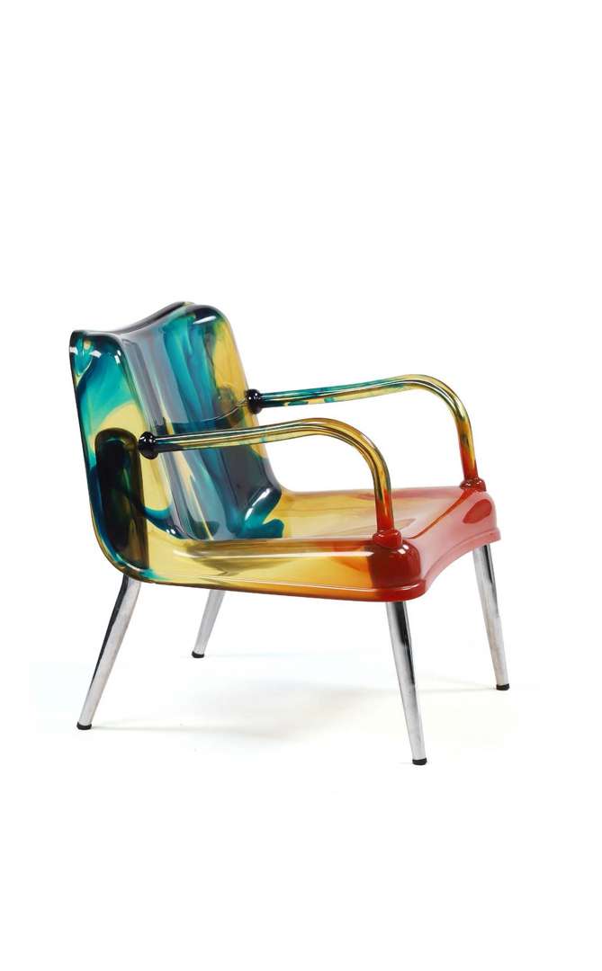 A «Chaos » armchair, c. 1990, chrome-plated steel structure, seat and backrest in moulded and tinted resin, chrome-plated steel feet.