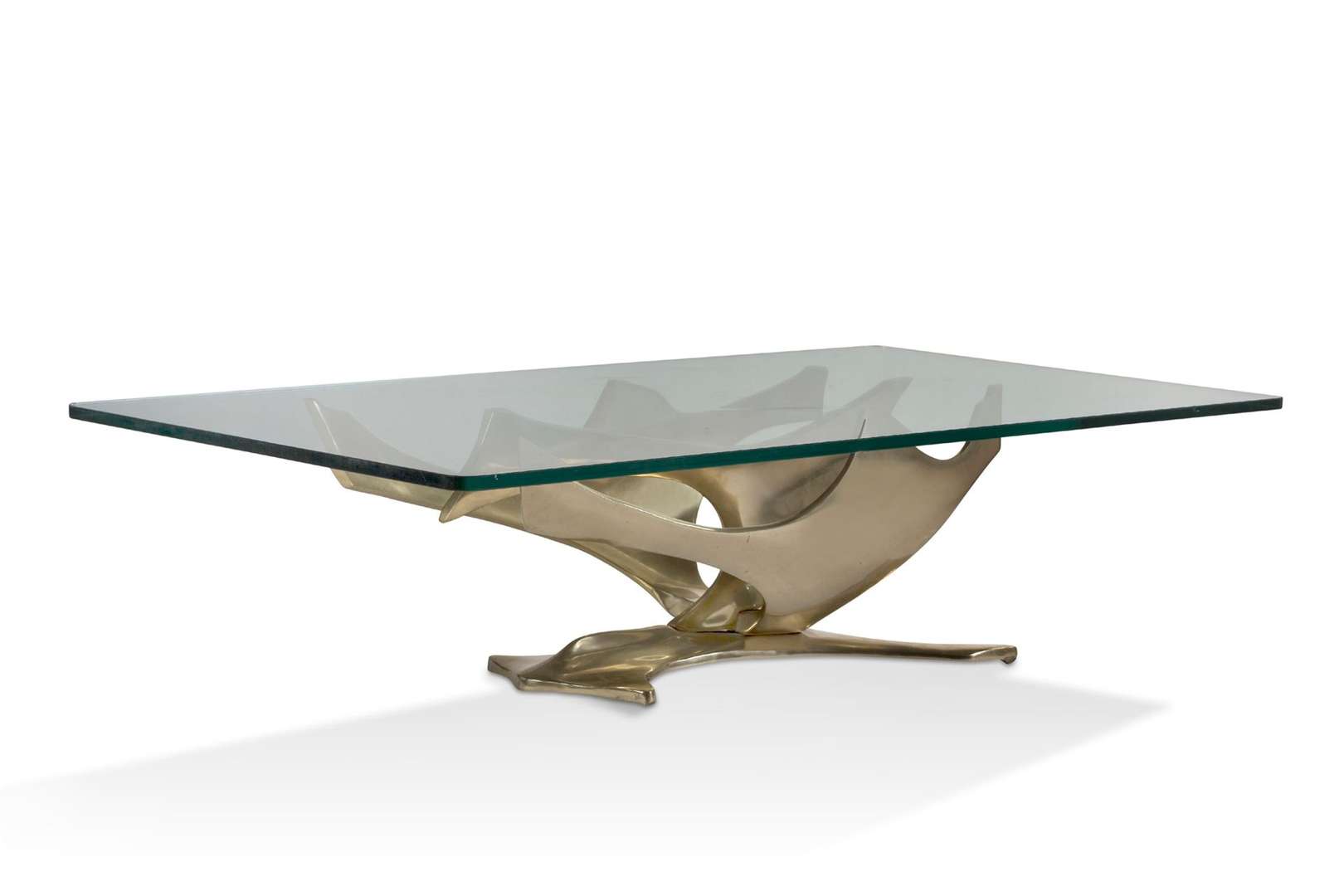 Piètement de forme libre en bronze doré, soutenant un plateau rectangulaire à bords arrondis en verre légèrement fumé.