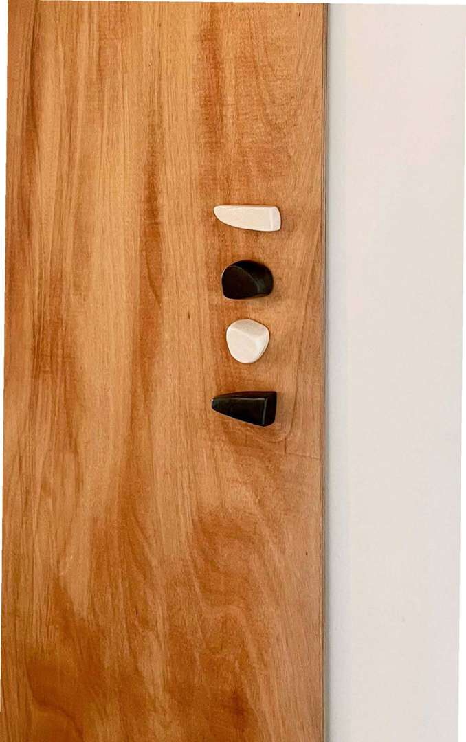 A set of four handles, 2024, unique pieces, enamelled earthenware and stoneware.