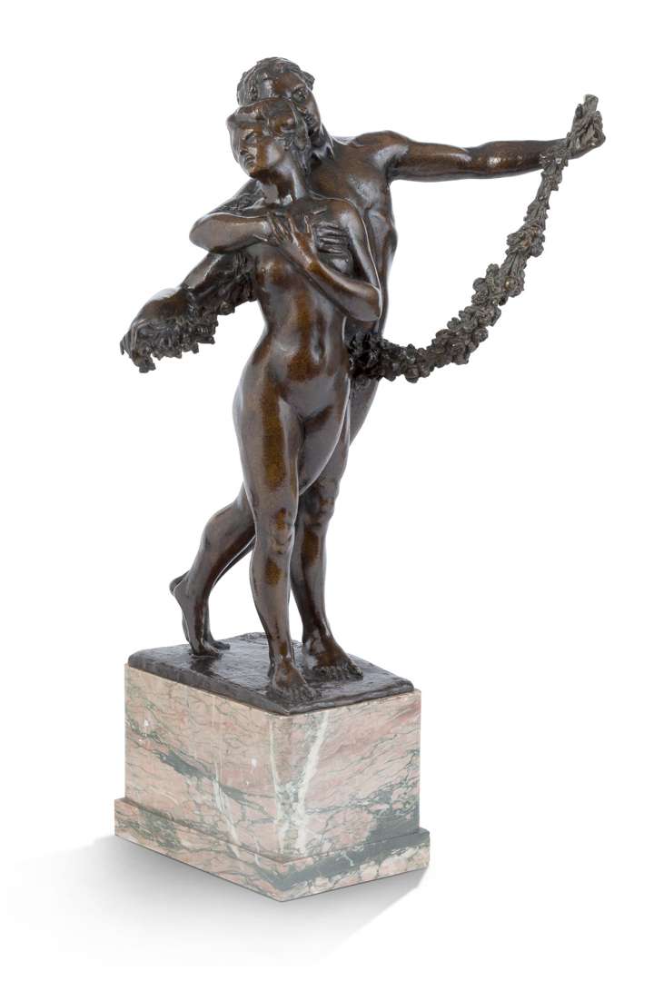 Cette oeuvre, non répertoriée par Messieurs Werner Adriaenssens et Raf Steel, est une variante de Éternelle idylle, groupe figurant notre couple suivi de deux personnages féminins, dites "les soeurs", créé vers 1910-1911 et décliné en marbre, bronze et argent. Il pourrait s'agir du groupe Fiançailles, créé en 1911, mais dont l'image n'est pas conservée (n°236 ou 237 de l'ouvrage précité).