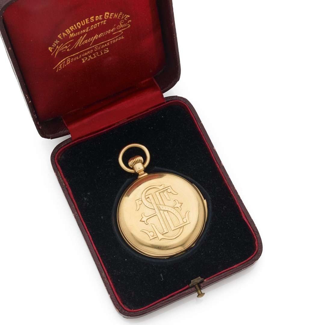 A 18k yellow gold manual winding keyless repeating pocket watch With a presentation box from the period signed « Aux fabriques de Genève, Maison E.Cotte» and stamped « L.S »
