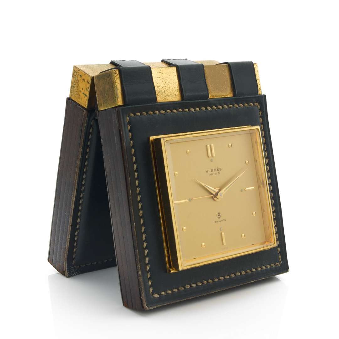 A gilt metal and leather manual winding desk clock with alarm function, designed by Paul Dupré-Lafon. With a Hermès pouch (Hermès Limoges)