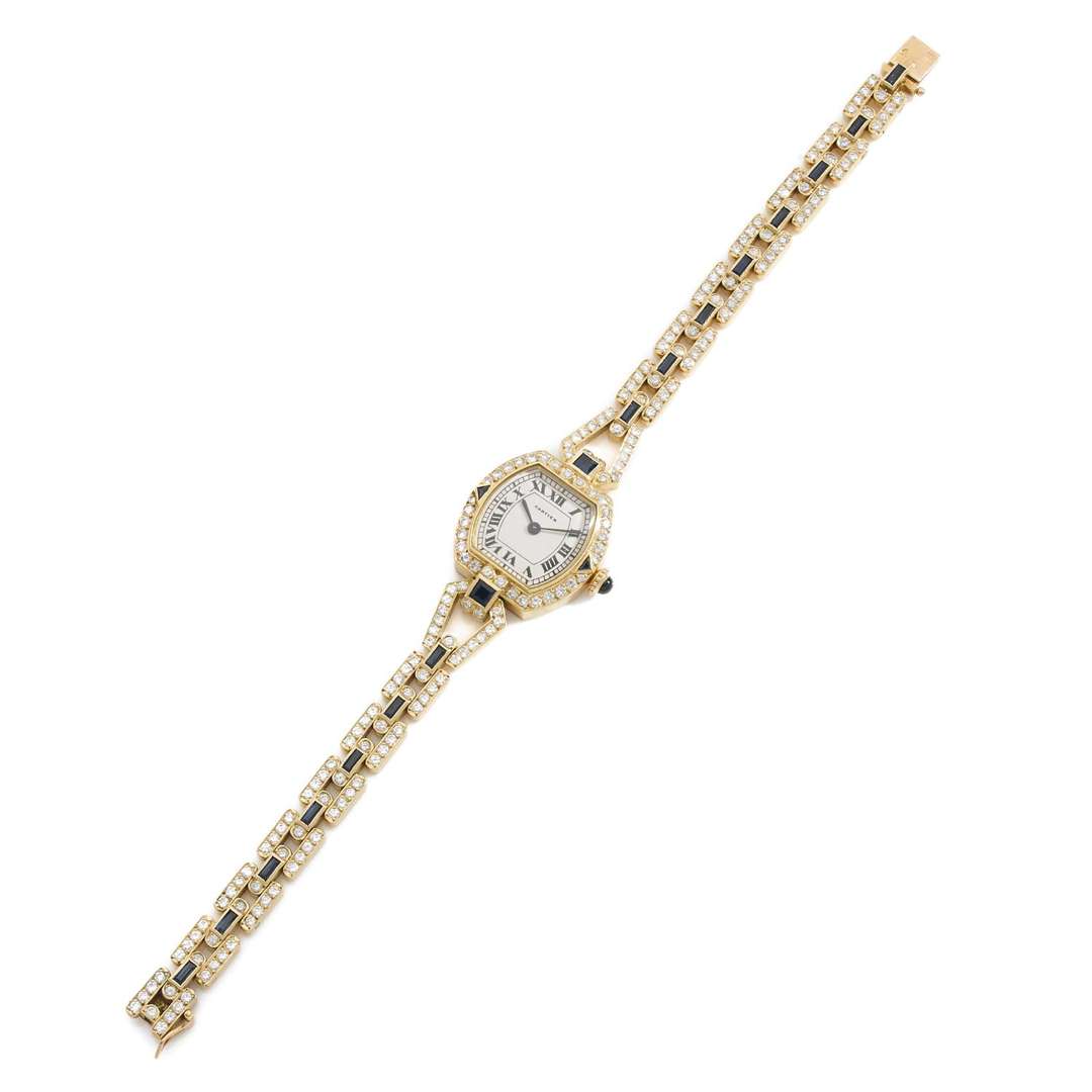 Peu courant, ce modèle est une série spéciale exécutée par Cartier très probablement vers 1984/1985. Cette montre fut déclinée avec 2 versions de bracelet, l'un en or ajouré et serti de diamants et de saphirs comme notre exemplaire, l'autre en perles.