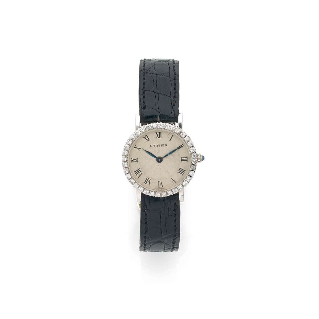 Cadran : argenté et guilloché, index chiffres romains noirs peints, aiguilles feuilles en acier bleuie, signé « Cartier »