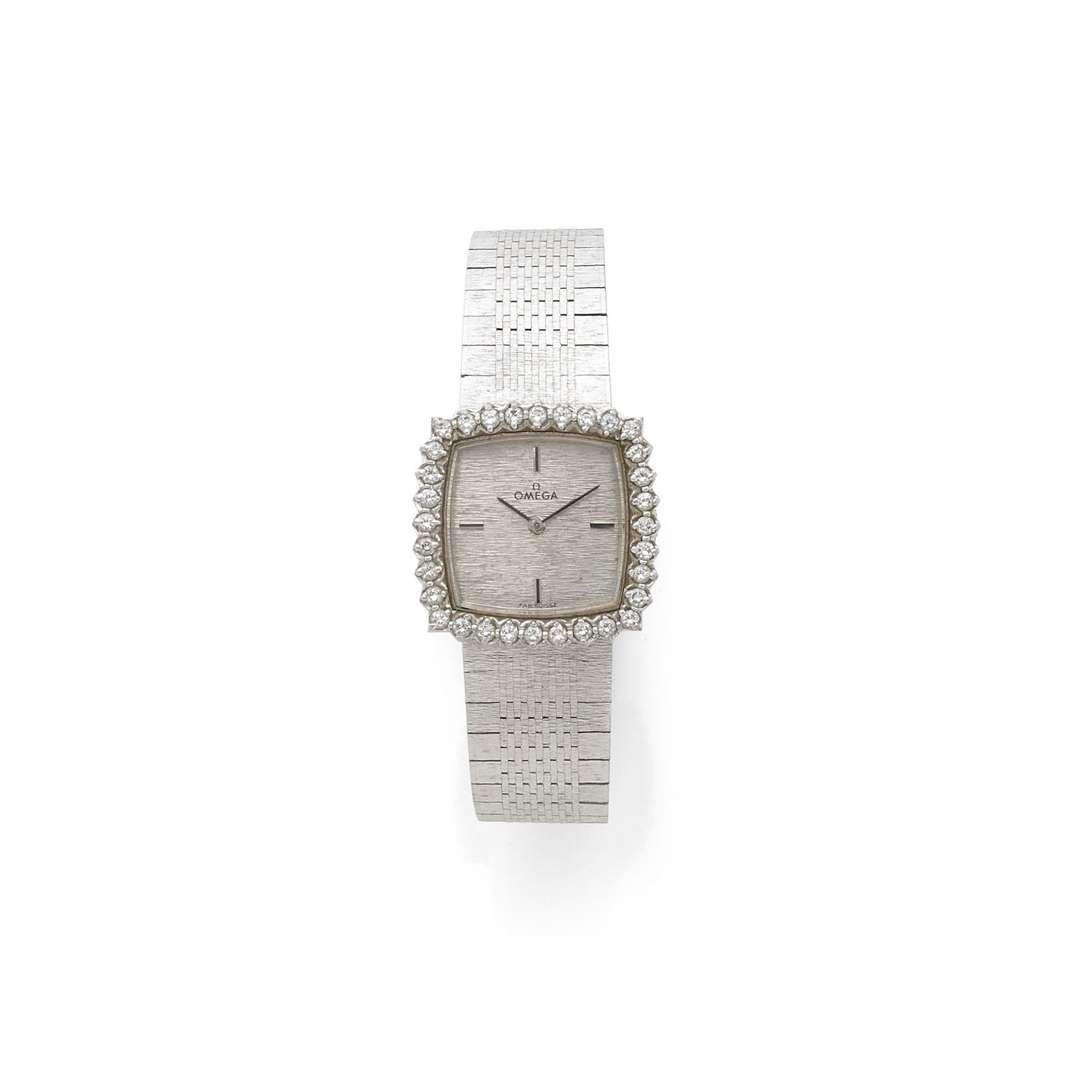 Boîtier : carré, lunette sertie de 32 brillants, fond fermeture à pression, signé
