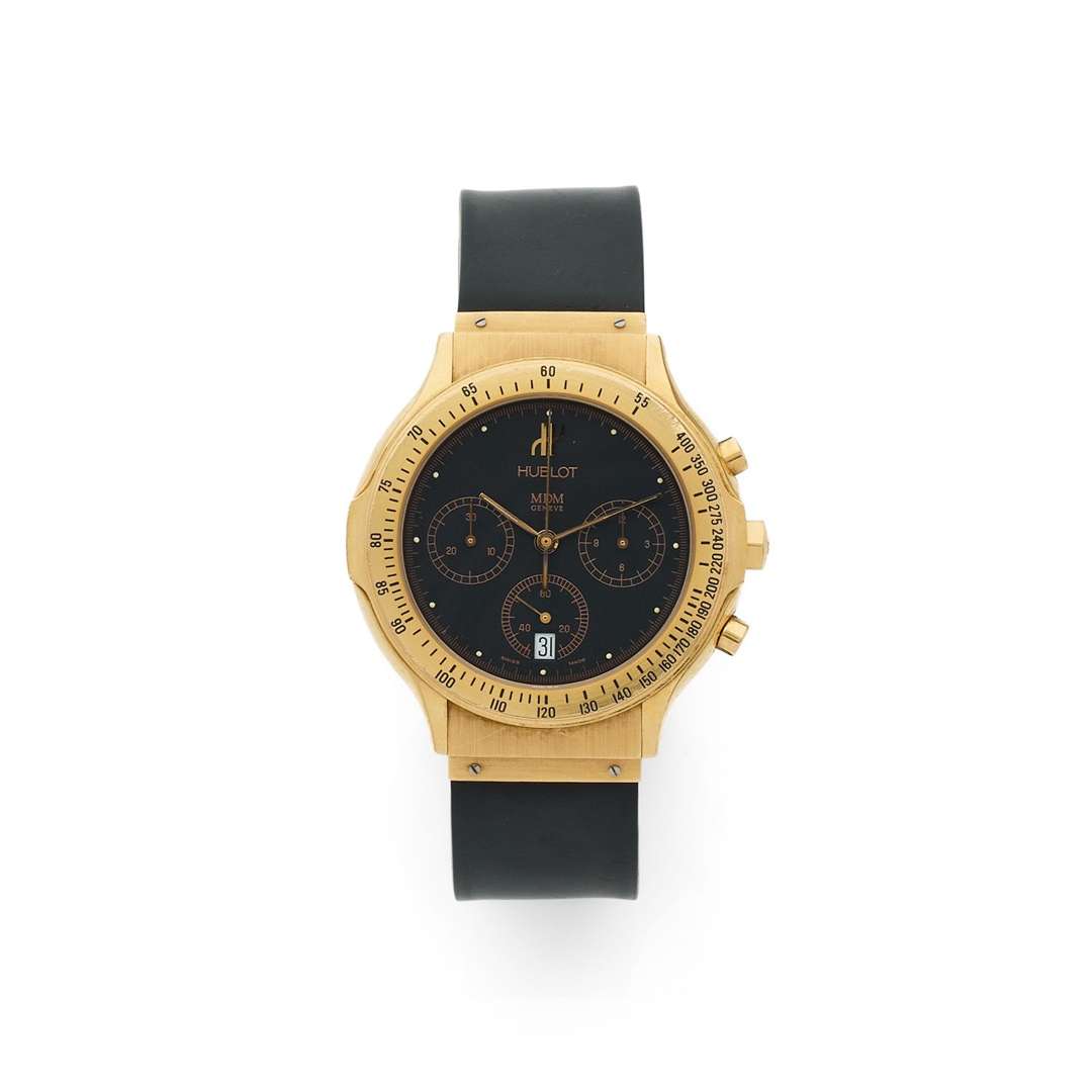 A 18k yellow gold quartz chronograph wristwatch, rubber strap with Hublot deployant clasp