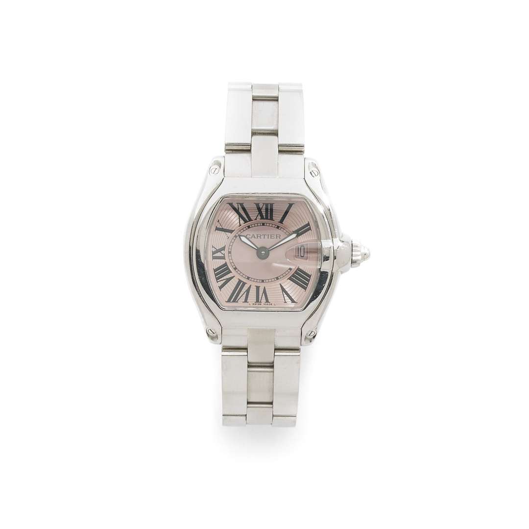 A stainless-steel quartz wristwatch, stainless steel bracelet with deployant clasp signed, with a Cartier service pouch