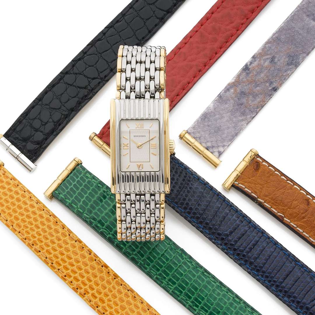 A stainless steel and 18k yellow gold quartz lady's wristwatch, a stainless-steel and gold bracelet with a set of 7 leather straps