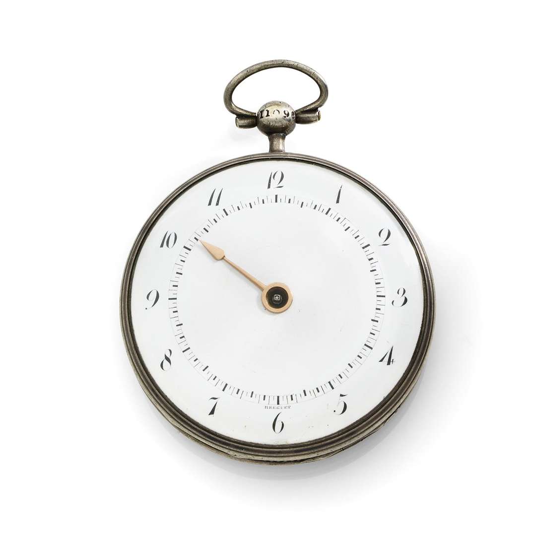 Mouvement : avec remontage à clef, coq ciselé et percé, fixation sur deux pieds, disque de réglage, signature apocryphe « Breguet No. 11101 »