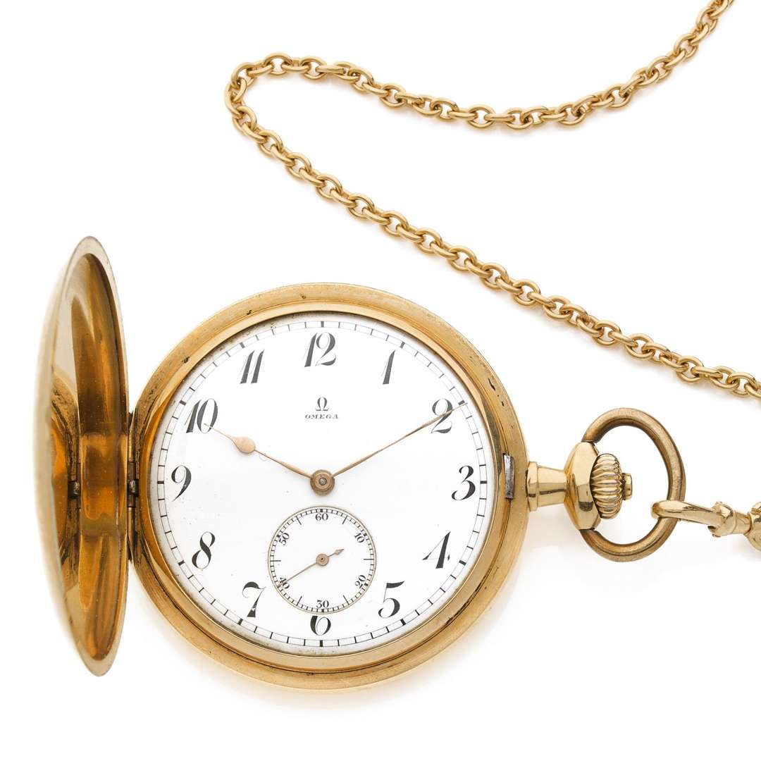 A 18k yellow gold manual winding hunting cased pocket watch, with a gold chain