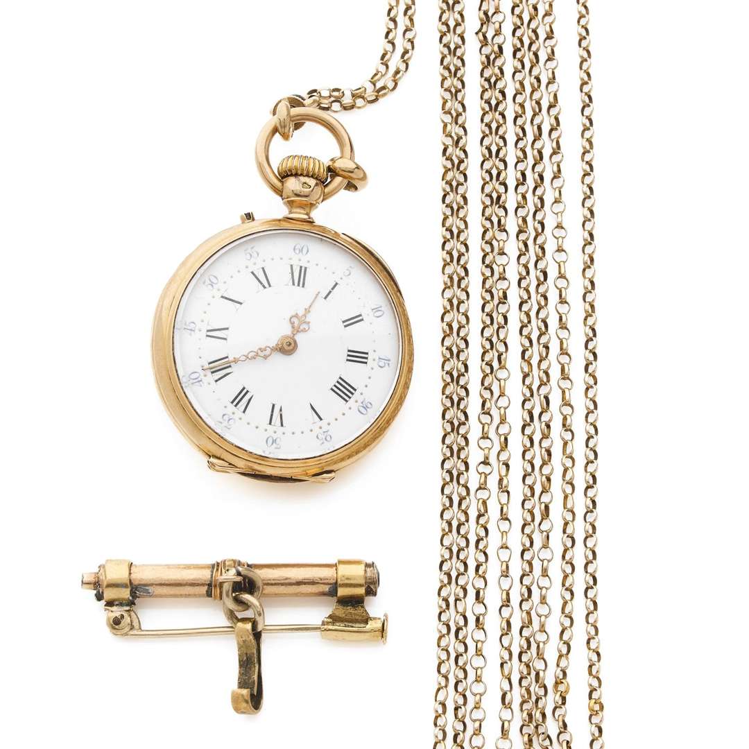 A 18k yellow gold manual winding pendant watch. With a gold chain and a brooch (15,20 g.)