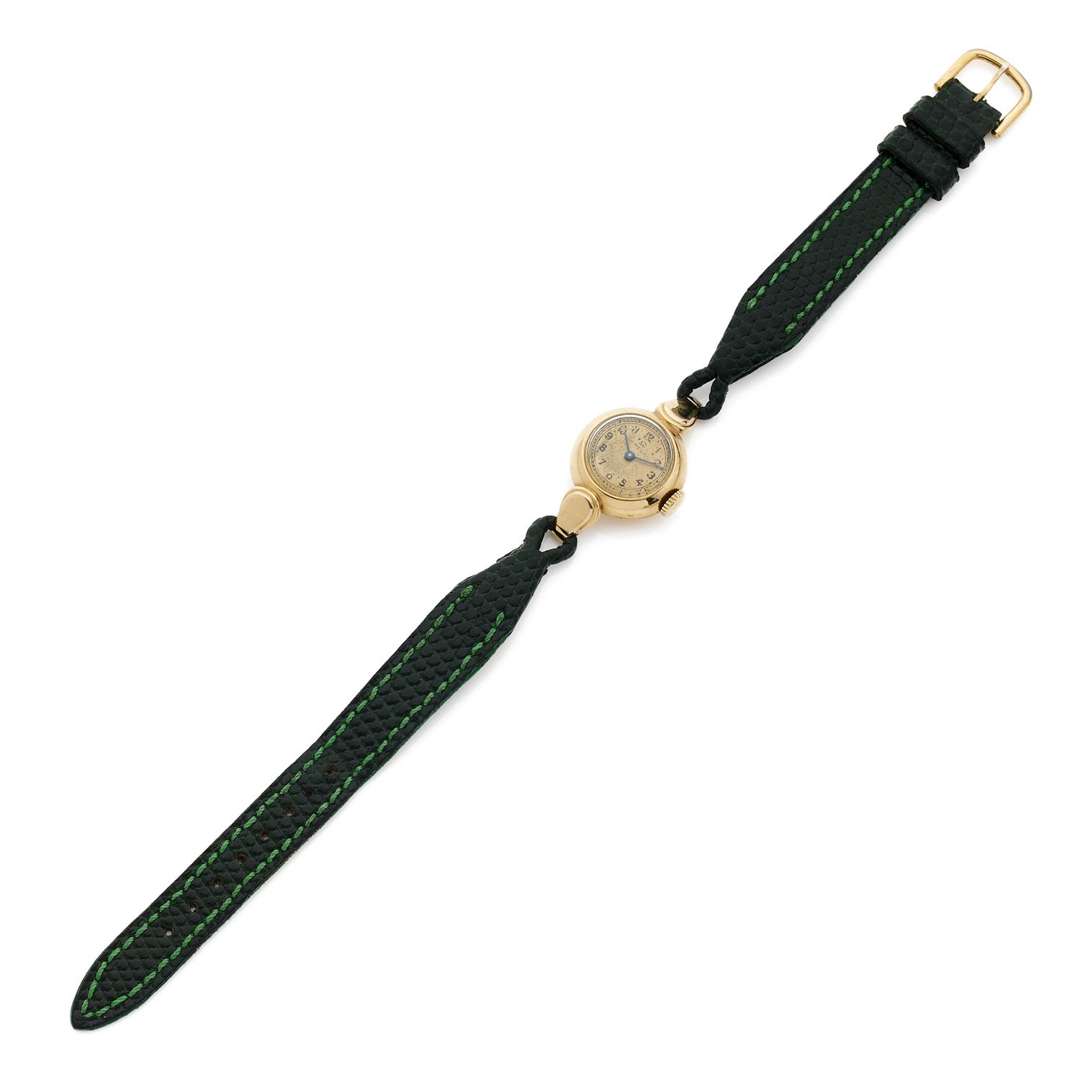A 18k yellow gold manual winding lady's wristwatch with leather cord bracelet