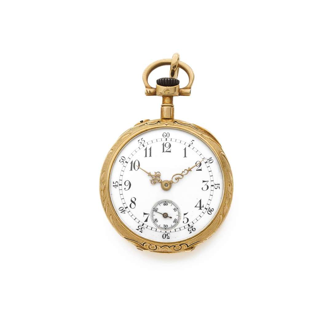 Boîtier : rond sur charnière, le dos décoré d'émail et de motifs feuillagés, signé sur la cuvette et portant les mentions « 26 juillet 1904 » « F. BRONN FABt GENÈVE »