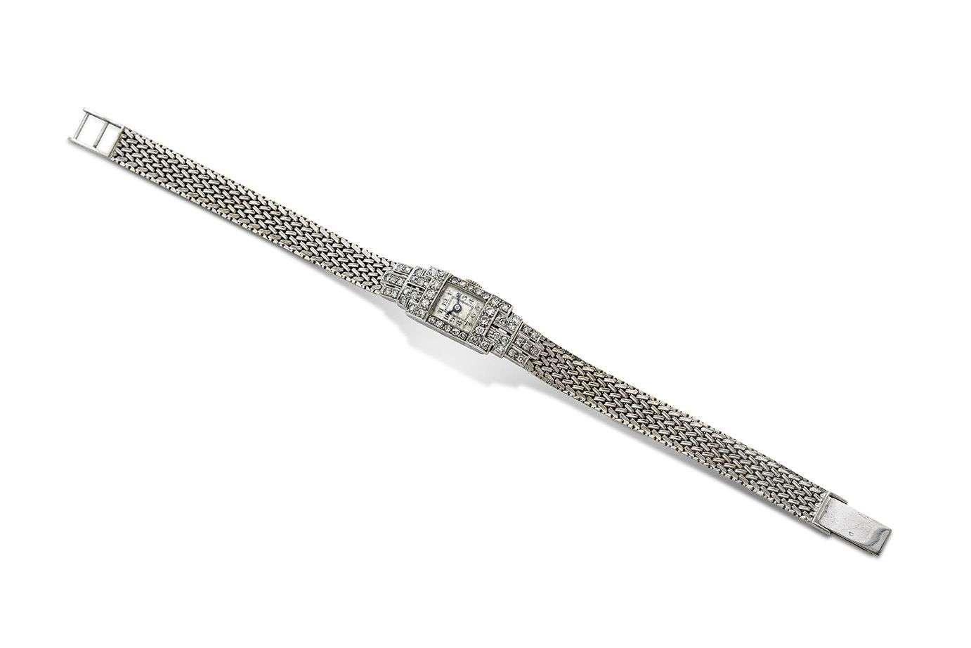 Boîtier : en platine, rectangulaire géométrique, sertie de diamants, fond clippé
