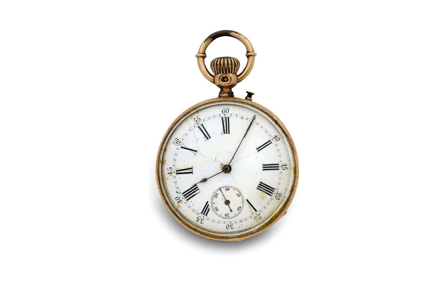 Cadran : email blanc (fêles), index chiffres romains et graduation des secondes peints, petite trotteuse à 6h