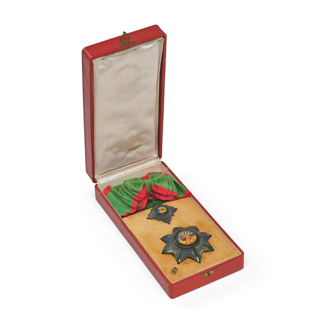 Ensemble de grand-croix en vermeil (?) Et émail vert comprenant sa croix accompagnée de son ruban et sa plaque.