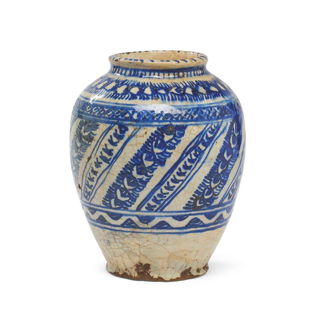 de forme pansue en céramique silicieuse à décor sous glaçure blanc et bleu de frises stylisées