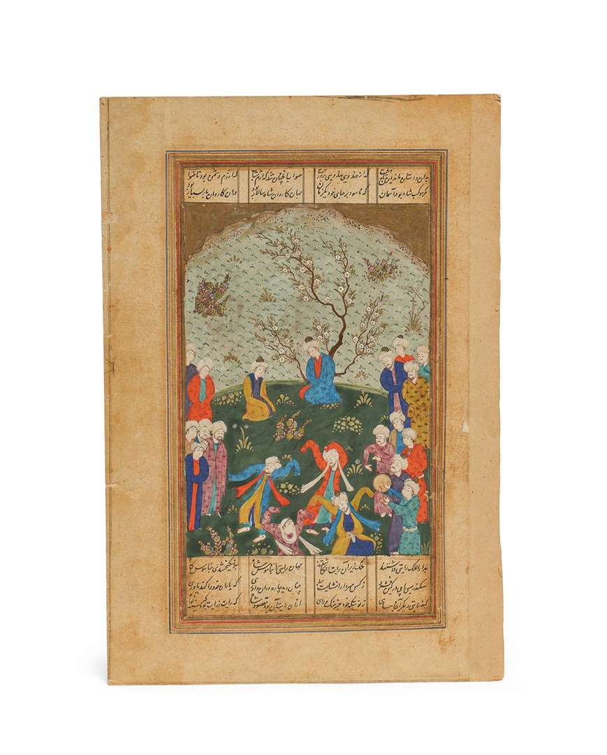 Encre et gouache polychrome sur papier monté sur une page cartonnée. Texte écrit en nast'aliq, dans quatre colonnes interrompues par la miniature.