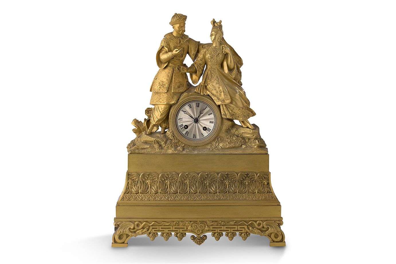 en bronze ciselé et doré ornée d'un couple vêtu à l'orientale et assis sur un rocher dans lequel est inscrit le cadran.