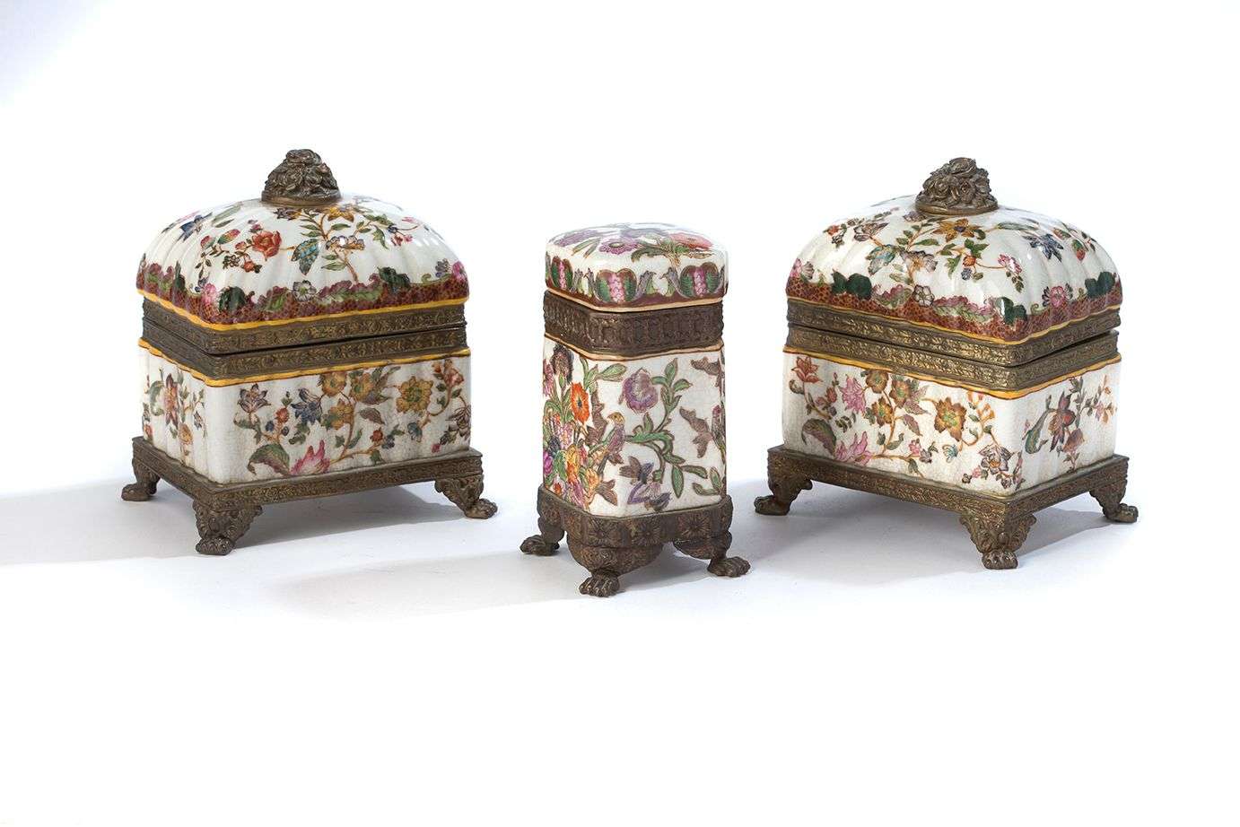 Paire de petits coffrets de forme rectangulaire et un pot de forme carrée en porcelaine craquelée blanche à décor floral polychrome.