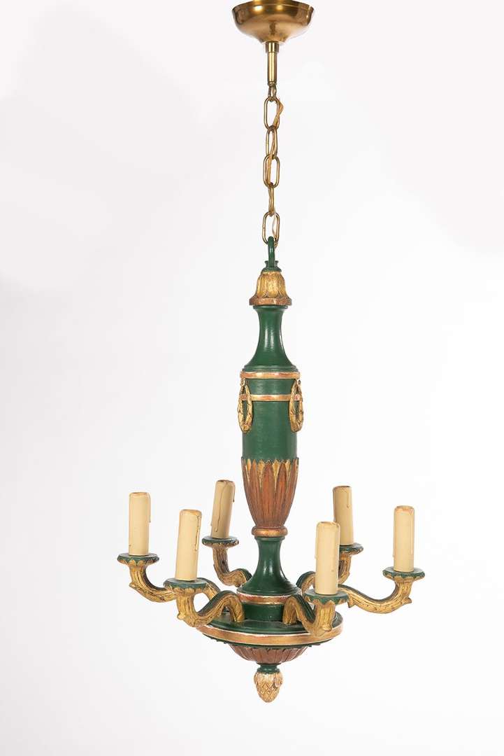 à six feux en bois sculpté, laqué vert et doré. Le fût en urne en forme de vase à l'antique