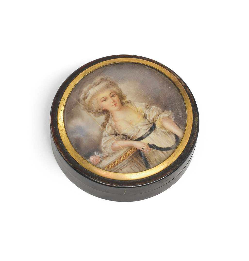 de forme circulaire. Le couvercle est orné d'un portrait miniature cerclé de laiton représentant une jeune élégante accoudée.