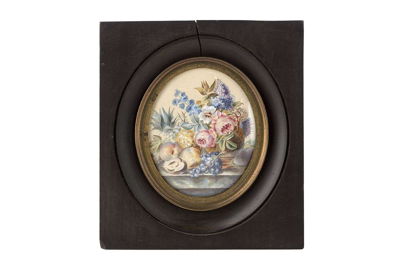 sur papier peintes à la gouache de natures mortes sur un entablement.