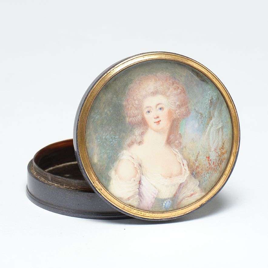 de forme circulaire. Le couvercle est orné d'un portrait miniature cerclé de laiton représentant une jeune élégante en buste de trois quart.