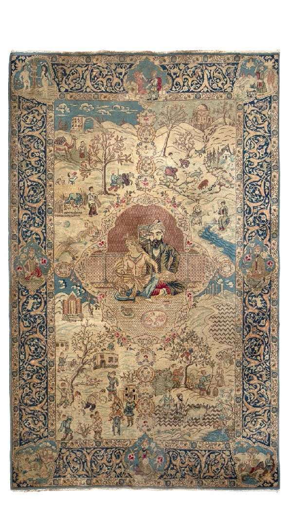 Champ beige à original décor de scènes relatant la vie quotidienne des villageois persans avec chaque saison : on voit un bonhomme de neige en bas à gauche, la représentation de la moisson, le printemps est symbolisé à droite et l'automne en haut à gauche.