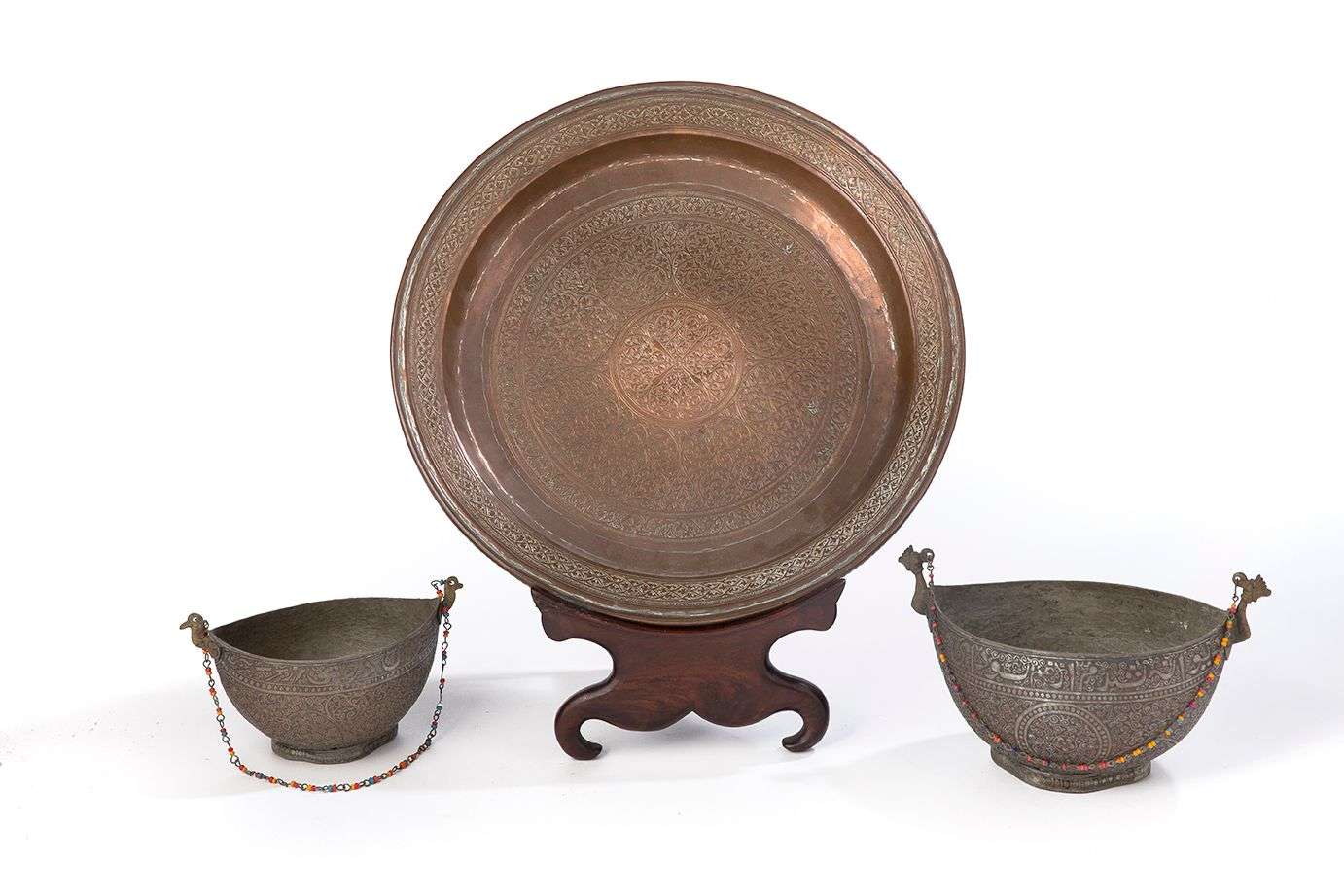comprenant deux bols à suspendre dits kashkul et un grand plat circulaire.