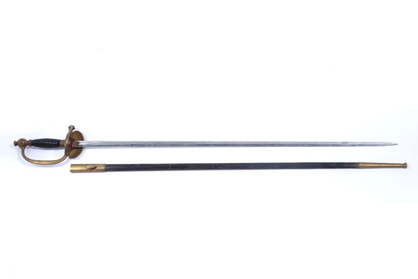 Fusée en corne noire, avec filigrane. Monture en laiton doré. Garde à une branche. Clavier à la cuirasse, canons croisés entourés de feuillages. Contre-clavier à pompe. Lame à deux tranchants et deux gouttières à la moitié. Fourreau en cuir, à deux garnitures en laiton doré. ~